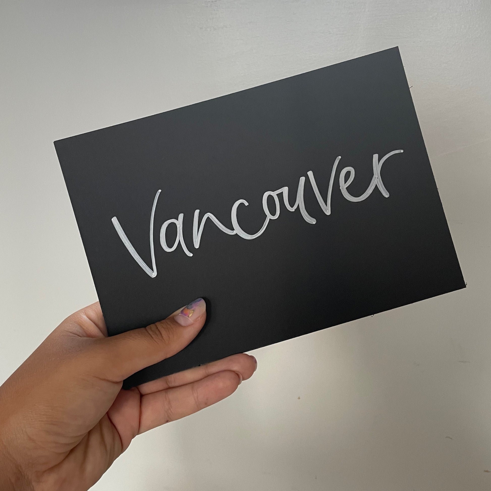 A5 Table Names with white brush calligraphy on smooth matte black 300gsm card.