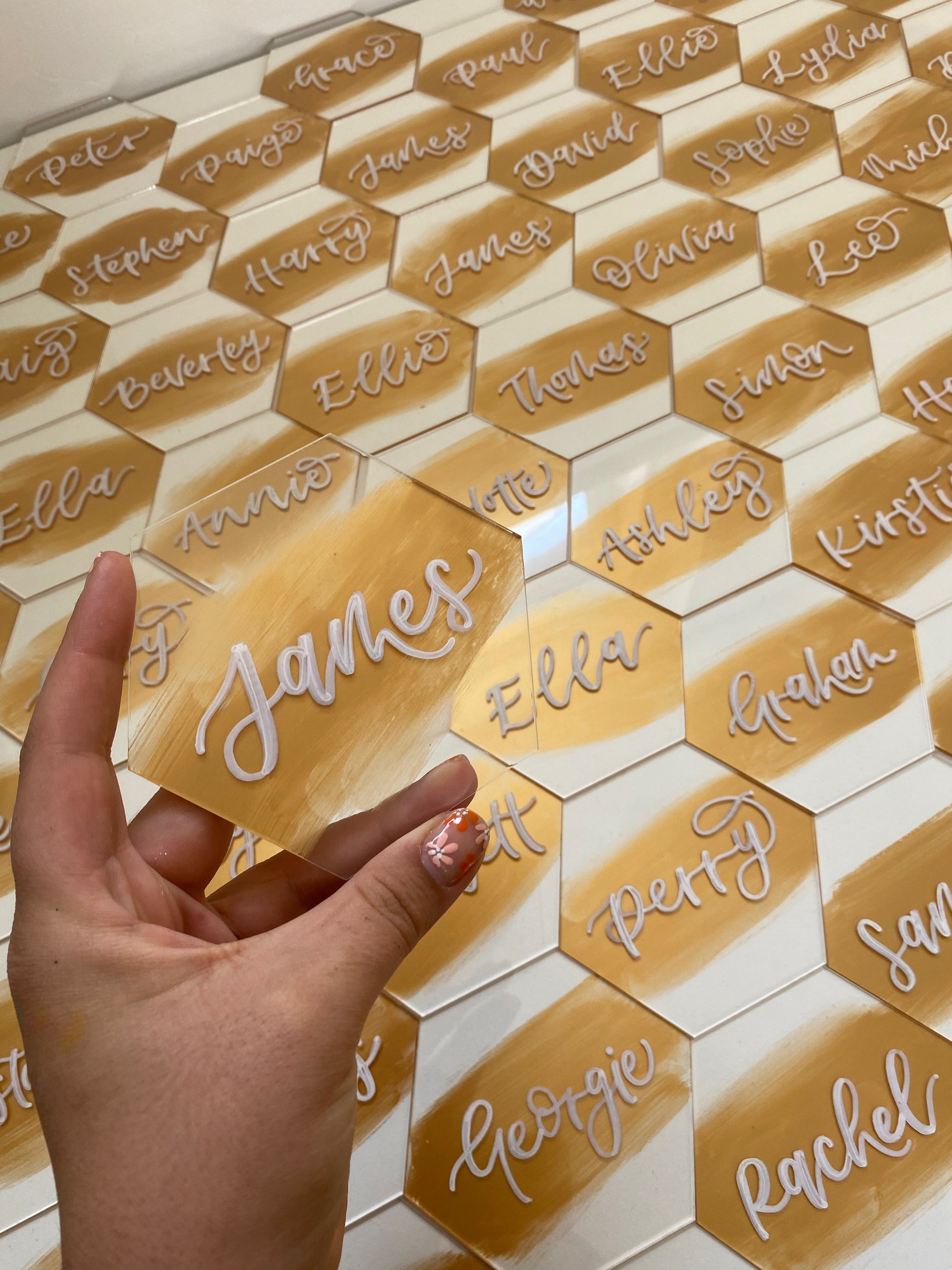 These place cards are handwritten with modern calligraphy on a clear hexagon perspex piece measuring approx 9x9cm.